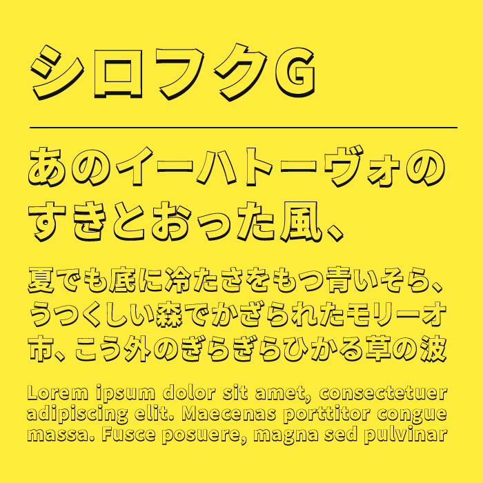 シロフクGフォントは、袋文字になった文字に影がついたようなユニークなゴシック体です。